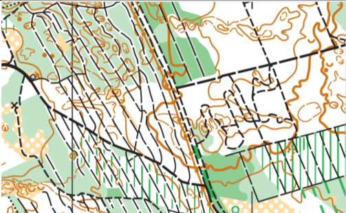 | Terrænbeskrivelse: Består af både ældre hedeplantage og nyplantet skov. Meget varieret bevoksning, afvekslende løv og nåleskov med mange mindre åbne områder. En del helt åben og let gennemløbelig skov men også partier med en del undervegetation og ris efter skovning, og mindre partier med svært gennemløbelig yngre skov. Detaljerigt med mange stier og spor. Terrænet varierer fra forholdsvis plant over lettere kuperet til mere storkuperet. Kurvebilledet er mange steder ret detaljeret. |